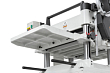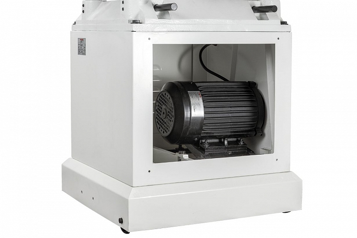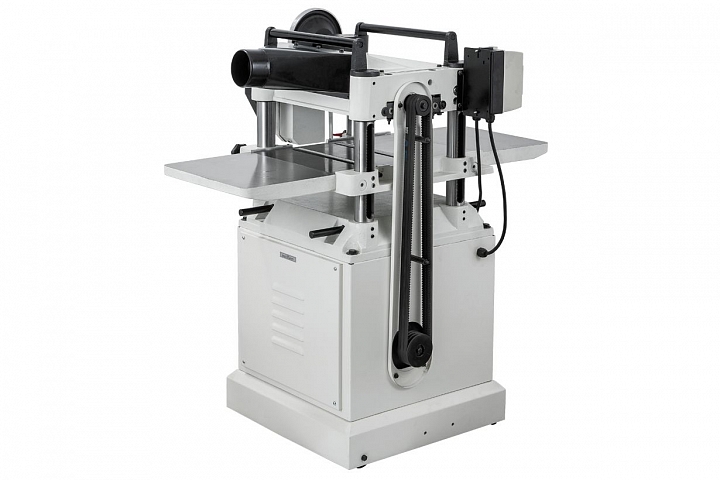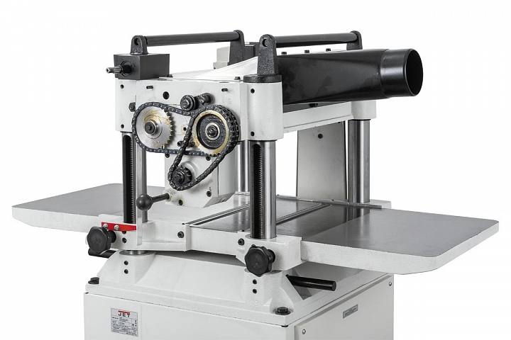 Сверху направляющих колонн установлено два металлических ролика для обратной подачи заготовок. Рабочий стол станка, его удлинения, основание и строгальный узел сделаны из чугуна. Регулировка просвета происходит при подъеме и опускании стола, в нижнем положении расстояние до ножей превышает 200 мм, что позволяет пропускать крупные брусья или доски, поставленные на ребро.